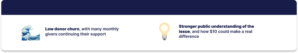 Instead of focusing on major donors or high-dollar one-time gifts, we built a campaign around a low-barrier ask with high impact. For the donor, $10 a month felt manageable. For the organization, recurring donations at that level provided a steady stream of support and long-term sustainability.
