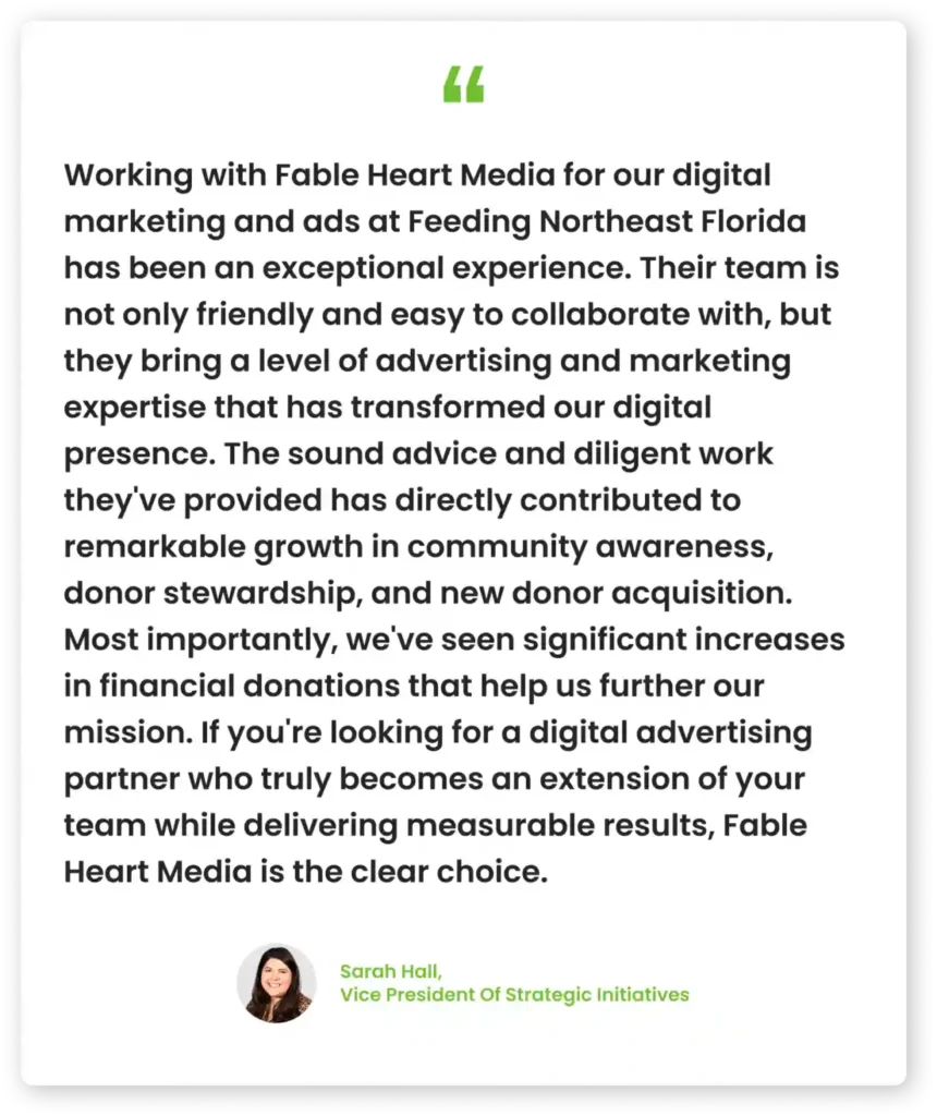 This work is ongoing. With new campaigns launching and fresh creative regularly tested, the partnership between Fable Heart Media and FNEFL continues to evolve. But the goal remains the same: serve more people, close the hunger gap, and invite the community to be part of the solution.