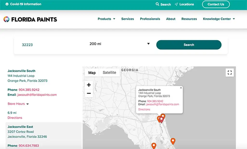 Florida Paints needed a customized tool to assist their customers in finding their locations. We developed a store locator, leveraging Google API. We went a step further and added items like store category, store hours, and contact information. Locations automatically load on the map based on the users location. Like the product tool, the store locator can be easily updated by Florida Paints within the WordPress site.
