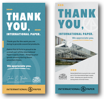 PRAP wanted to take the time to thank one of their largest rail customers for continuing to work and keep the supply chain moving during Covid. The print ad was to be distributed to the town the paper mills operate within and to the paper plants themselves. Instead of using PRAP’s branding, we used the customers to really show appreciation. Our team incorporated elements of their logo to further tailor the design to the customer. The ad’s message is clear and thoughtfully placed. As always, we created multiple variations for the client to choose from.