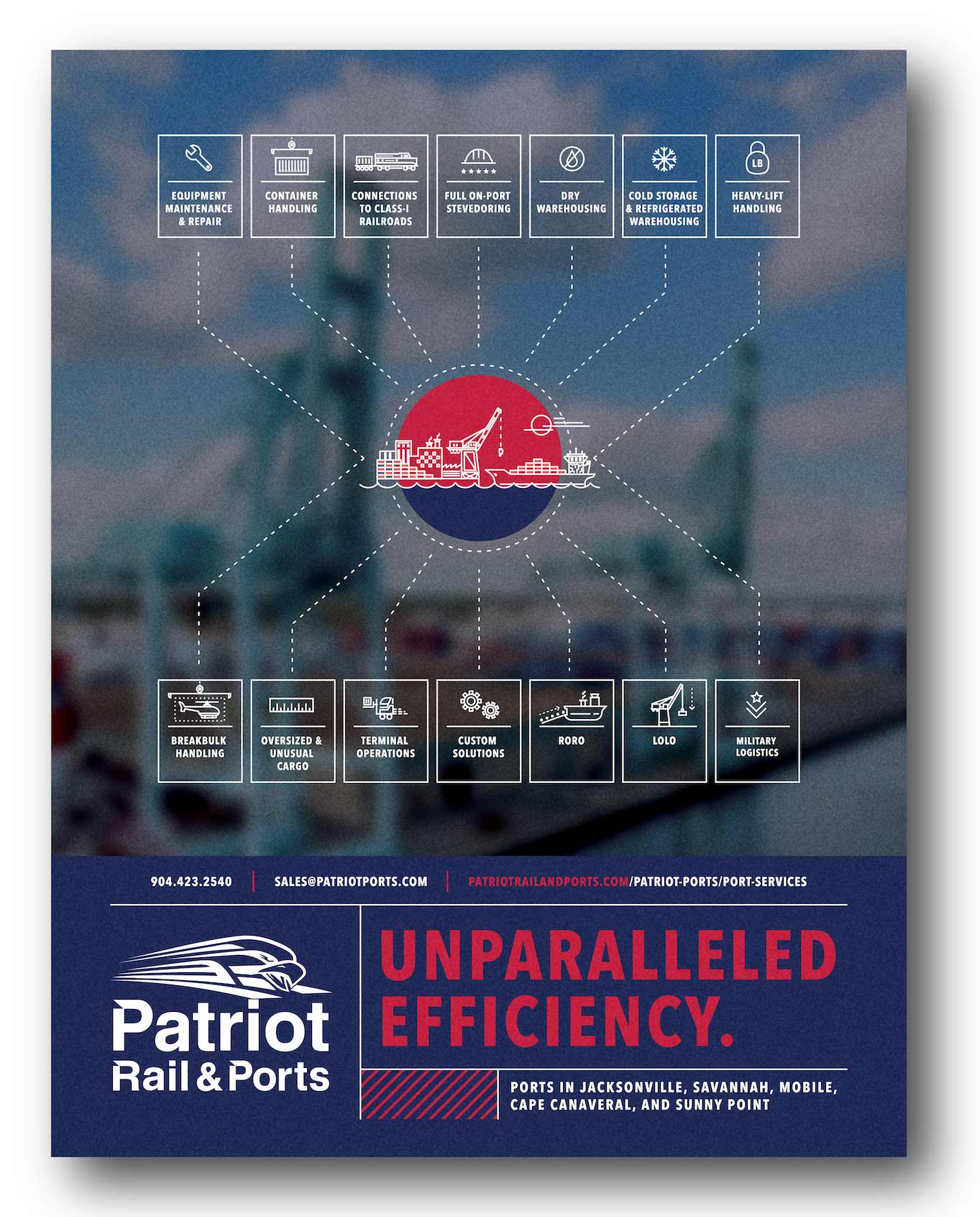 The goal of this ad was to drive people to contact Patriot Rail & Ports for port services. The ad was placed in a local transportation directory. We needed to list all of PRAP’s port locations and highlight the services and capabilities that they offer throughout the Southeast. We were sent a long list of services to include and we weren’t working with much real estate. Our team designed a custom graphic to display this vast amount of information in an aesthetically pleasing format. The arms reaching to each service represent transportation channels leading to the hub: Patriot Rail & Ports.
